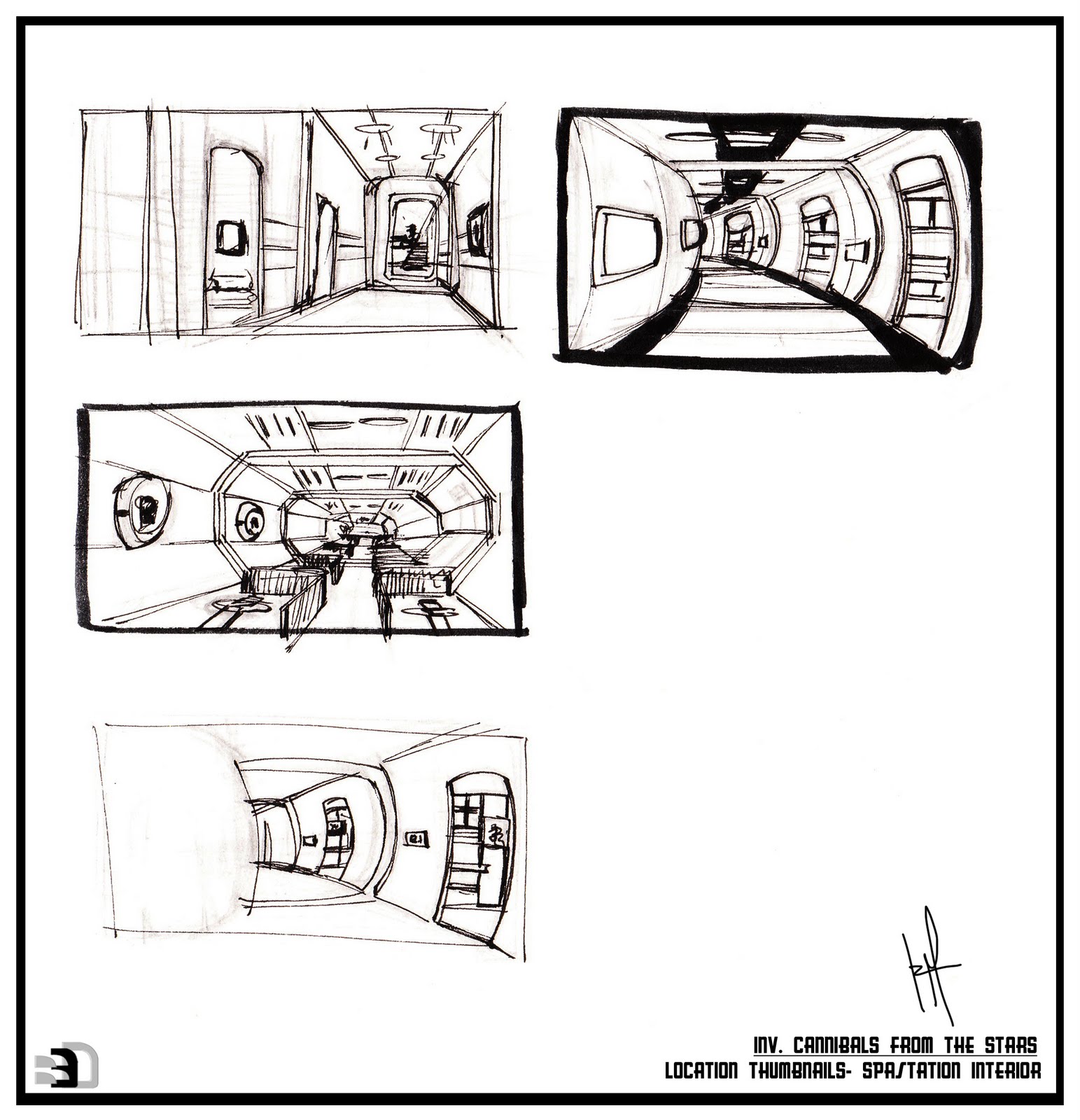 After getting the Spacestation done, I tried to get done some more environment thumbnails to be painted later digitally, next stop was the interior, of the spacestation, bearing in mind the style and how the things would work inside it, I drew some quick sketches, to determine perspective and composition.